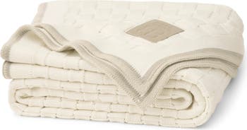 Knit with an inviting basket-weave pattern, this drapey organic-cotton blanket is perfect for snuggling up during a movie night.