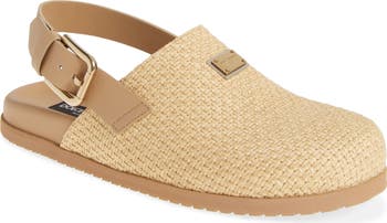 An engraved logo plaque adds signature shine to a resort-ready clog boasting a buckled slingback and artisanal basket-weave raffia.