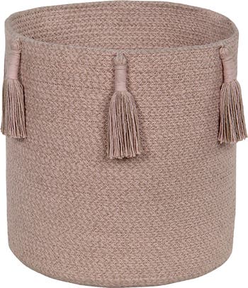 Inspired by the ever-changing tones of nature, the round Woody basket is crafted from mixed cotton cords, blending two color shades for a unique, natural look. Available in Honey, Olive, Pearl Blue, Soil Brown and Vintage Nude, each basket is finished with handcrafted, multicolored tassels attached along the edge.