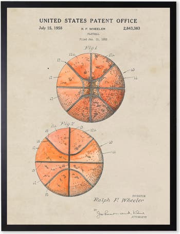 This vintage-inspired print, framed in a black wooden frame, features a basketball patent. Sized at 16 inches by 20 inches, this made in the USA frame makes for a beautiful addition to any wall.