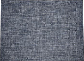 A mix of blues and metallic hues highlights the deeply textured weave of this minimalist floor mat designed to be durable and secure.