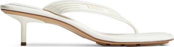 A slender kitten heel gives a resort-ready lift to this flip-flop sandal featuring ridged rubber straps embossed with a block-letter logo.