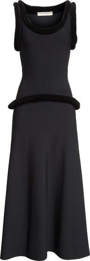 This tank dress from designer Rachel Scott's spring '26 runway presentation features the sculptural piping seen throughout this collection, showcasing the scooped neckline, framing the shoulders and segmenting the high-low silhouette.