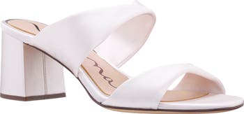 Artfully twisted straps frame this elegant satin slide sandal lifted by a modest block heel for party-ready style.