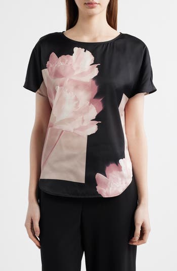 Dolman sleeves frame this boxy satin top made with an eye-catching floral placement print and a tuckable curved hem.