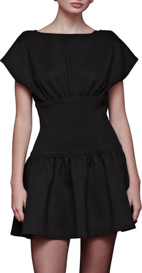 This chic cap-sleeve minidress achieves a corset effect by contrasting the gently fitted waist with the roomy dolman-sleeve bodice and voluminous skirt.