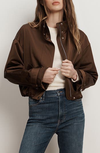 Polish a casual look with a cotton-blend jacket offered with silvery hardware and topped with a smart stand collar.