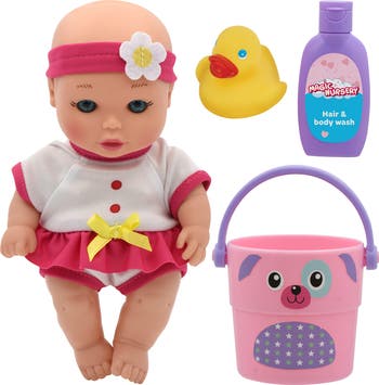 It's bath time, so get your baby doll and have some bath time fun with her! Magic Nursery 8" Love Buckets is all about fun in the tub with your favorite baby doll. Load up your bucket with some water and splish, splash into fun. Make sure you have your rubber ducky with you too. Includes 8" baby doll with removable outfit and safe to place in the tub, bucket to play with and 2 play bottles to pretend to wash and clean your baby with. Of course, don't forget your rubber ducky for your bath! Perfect for ages 2 and up.