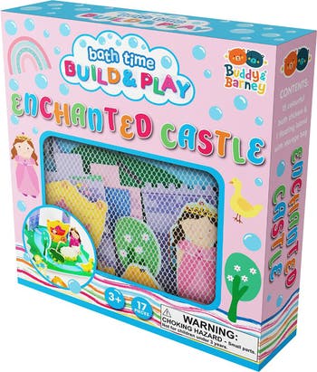 BATH TIME: BUILD & PLAY - ENCHANTED CASTLE - Turn every bath into a fairytale adventure with the Buddy & Barney Bath Time Build & Play Princess Castle! This magical bath toy set features princess-themed 3D bath stickers that let children create their own royal kingdom. The colorful foam pieces float in the tub or stick easily to tiles and tubs when wet, inspiring endless imaginative play. The reusable design makes cleanup simple—just remove, rinse, and store for next time. Made from quality, BPA-free, non-toxic materials, these stickers are safe for little hands, making them perfect for babies and toddlers. Whether building castles, arranging princesses, or creating storybook adventures, this set transforms bath time into an engaging and creative experience. Perfect for birthdays, holidays, or just because, it’s a gift that combines fun and learning in one magical package! Little ones can imagine grand royal balls, brave rescues, or enchanted garden parties as they bring their kingdom to life. Each bath becomes a new chapter in their magical fairytale world. INCLUDES: 15 Foam Pieces, 1 Floating Island, and 1 Mesh Storage Bag.