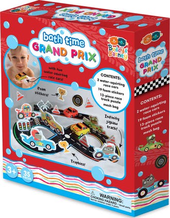 BATH TIME: GRAND PRIX - Rev up bath time with the Buddy & Barney Racing Car - Grand Prix Bath Time Set, the ultimate water play and building toy for toddlers and young children! This vibrant and interactive bath set combines exciting water squirting cars with fun bath stickers and customizable track pieces, turning ordinary bath time into an imaginative Grand Prix racing adventure. Designed for unisex kids aged 3 and up, this set encourages motor skill development, creativity, and hands-on play. The set includes multiple colorful race cars, road signs, and easy-to-assemble track parts that snap together effortlessly, empowering young builders to create their own racing circuits. Whether it’s a solo challenge or a family race, children will love personalizing their tracks and zooming cars around, all within the safe, waterproof fun of the bathtub. Made from durable, non-toxic materials, this Grand Prix bath set offers long-lasting fun and peace of mind for parents. Perfect as a birthday, holiday, or special occasion gift, the Buddy & Barney Grand Prix Bath Time Set delivers hours of imaginative play and encourages early learning through playful interaction. INCLUDES: 2 Water-Squirting Toys, 19 Foam Pieces, 13 Track Pieces, and 1 Mesh Storage Bag.
