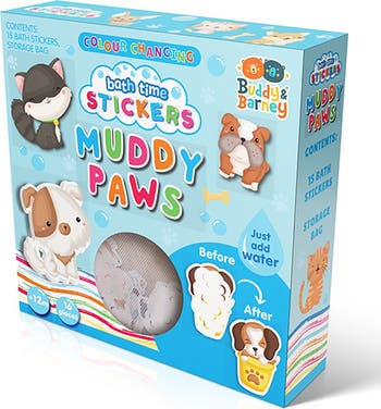 BATH TIME: BATH STICKERS - MUDDY PAWS CATS & DOGS - Turn bath time into an interactive, magical cleaning adventure with the Buddy & Barney Color Changing Bath Stickers – Muddy Paws! These adorable cats and dogs have had a busy day and are covered in mud—but with a dip in the bath, kids can watch in amazement as the “dirt” magically disappears, revealing their clean and colorful coats. Once dry, the muddy paw prints reappear, ready for the fun to start all over again! Made from durable, waterproof, and child-safe materials, these stickers stick easily to tiles and tubs when wet and can be effortlessly removed and repositioned for endless creative play. Perfect for sparking imagination, encouraging storytelling, and keeping little ones entertained, these color-changing bath stickers make bath time something kids will actually look forward to! The playful pets inspire giggles and role-play as children pretend to be groomers, vets, or caring pet owners. With each wash, kids build confidence and creativity while enjoying a mess-free, magical experience. INCLUDES: 15 Foam Pieces and 1 Mesh Storage Bag.