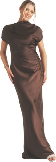 This Batwing Dress is for the bridesmaid who loves a little more coverage without compromising on style. With its elegant high neckline, bra-friendly shape and soft draping across the body, this chocolate satin dress brings a sophisticated and refined feel to the bridal party. The gentle ruching at the waist sculpts the silhouette, while the rich, on-trend hue keeps things feeling modern and elevated.