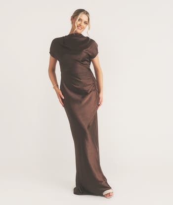 This Batwing Dress is for the bridesmaid who loves a little more coverage without compromising on style. With its elegant high neckline, bra-friendly shape and soft draping across the body, this chocolate satin dress brings a sophisticated and refined feel to the bridal party. The gentle ruching at the waist sculpts the silhouette, while the rich, on-trend hue keeps things feeling modern and elevated.