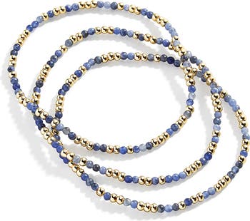 Smooth semiprecious beads are accented with golden baubles in these three bracelets that you can mix, match and stack.