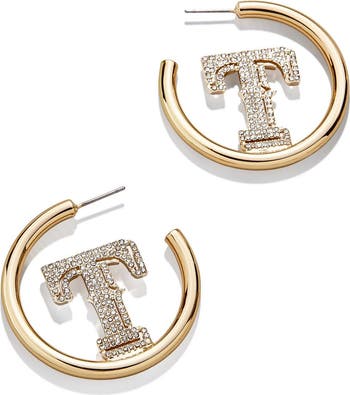 Step up your fashion game with this pair of Texas Rangers earrings from BaubleBar. The classic hoop design features the Texas Rangers logo with sparkly pave setting embellishments. Surgical steel posts help keep these gold-plated earrings in place.