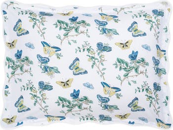 A garden of bright butterflies brings freshness to any bedroom with scallop-flanged sham made of crisp Egyptian-cotton percale.
