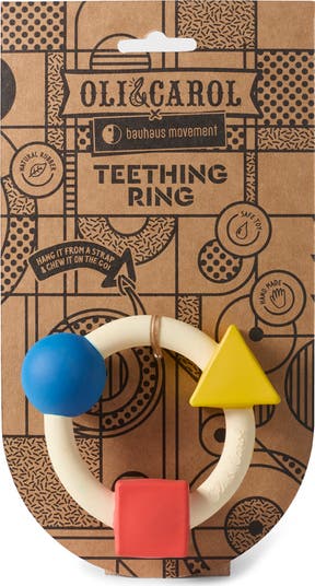 This handcrafted Bauhaus-inspired teether is made from natural Hevea-tree rubber with hand-painted details and no holes (so no mold can grow inside.)