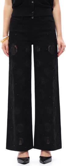 Embroidered floral designs create a bit of sheerness on these stretchy, studded jeans fashioned with full-length wide legs.