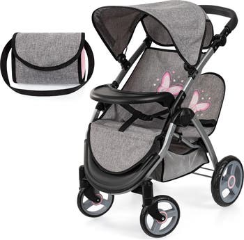 - PUSH YOUR DOLL IN STYLE: The Twin Dolls Stroller is designed for dolls up to 18" (46 cm). Transport your favorite doll, plush, or stuffed animal in style! The stroller has a lovely grey and butterfly design that your little ones are sure to love!