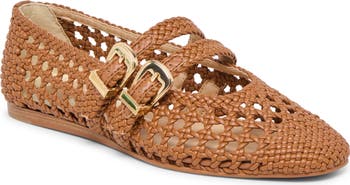 A pair of adjustable mary jane straps offer a secure fit and retro aesthetic on a leather flat featuring an intricately woven upper for stunning dimension.
