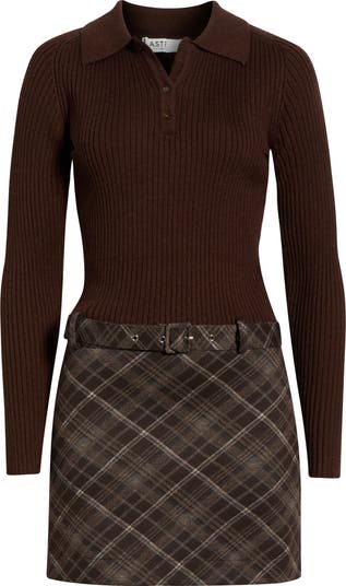 Opt for a two-piece look without the bulk in a dress that pairs a ribbed wool-enriched polo-sweater with a belted plaid skirt for a throwback '60s look.