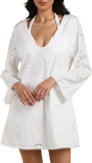 This eyelet tunic is made of breathable stretch cotton and cut in a flowy silhouette that makes it a perfect poolside cover-up option.