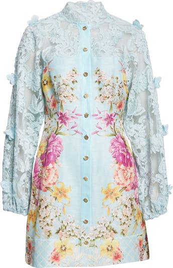 Sheer yokes and sleeves illustrated in embroidered floral lace frame this short shirtdress cut from a linen-silk blend patterned with a vibrant limited-edition print inspired by the color-soaked vibrancy of Turkish bazaars. Dainty butterflies alight on the lacy flowers and golden buttons, whimsically finishing the look.