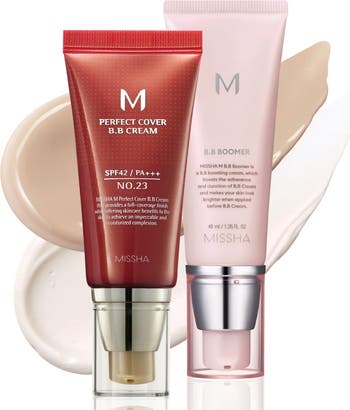 MISSHA's Viral Seller! The MISSHA BB Essential Kit combines the M Perfect Cover BB Cream and M BB Boomer for flawless, long-lasting skin. BB Boomer enhances foundation wear, provides wrinkle care, and leaves a dewy finish by forming a moisture barrier. Perfect for a quick, radiant complexion! M Perfect Cover BB Cream offers buildable coverage, SPF protection, and skincare benefits, while hydrating and soothing with ingredients like hyaluronic acid.