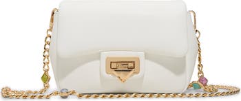 Colorful jewels add stunning opulence to the chain strap on a structured crossbody bag shaped from sleek faux leather and perfect for any occasion.