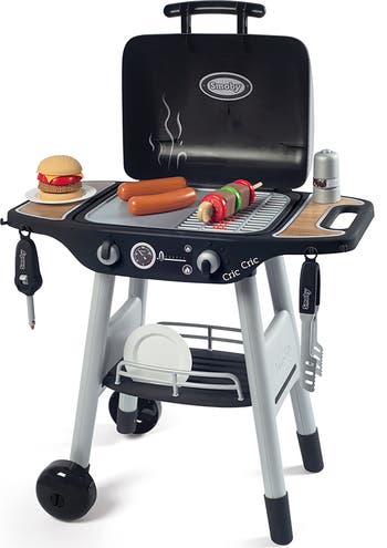 Smoby - BBQ Plancha Play Grill with Accessories - Summer is back, it's time to grill delicious meals! Kids can grill indoors or take the set outside and grill just like mom and dad. Turn the button and see flames appear! A grill side and a griddle side, to fit with every tastes. Includes 1 green pepper, 2 pickles, 1 slice of cheese, 1 meat patty, 2 bun halves, ketchup, tomato, 2 hot dogs, 1 chicken, 1 plate, and 3 kitchen utensils. Minimal assembly required. Suitable for ages 3 years old and up. Approximate dimensions are - 38.4 inches high x 14.5 inches wide x 19.6 inches deep. WARNING: CHOKING HAZARD -- Small parts. Not for children under 3 yrs.