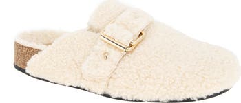 A shiny buckle and round studs add a little gleam to an everyday clog set on a cushioned, contoured footbed.