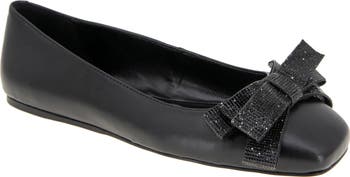 A rhinestone-encrusted bow tops the toe of a sophisticated flat shaped by a modern square toe and well-cushioned footbed to give your look an elegant boost.