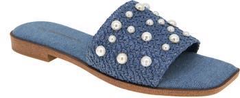 Imitation pearls stand out against the woven raffia upper of a statement-making slide sandal set on a cushioned footbed for comfortable wear.