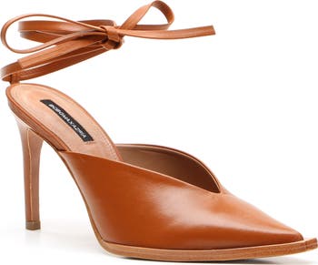 A wraparound ankle strap provides a dynamic finish for a stylish leather pump framed by a pointy toe and stiletto heel.