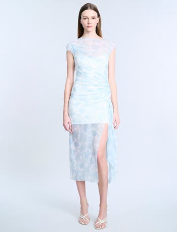 Sheer mesh midi dress featuring delicate ruching that wraps around the bodice and hip for a flattering contour. Designed with a high boat neckline and dramatic V-back for a romantic silhouette. Finished with an asymmetric draped overlay and thigh-high slit—crafted in floral printed mesh with a lightweight, ethereal hand.