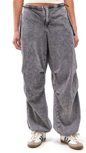A retro acid wash and baggy fit give a '90s aesthetic to denim jeans fashioned with a drawcord-toggle waist and cuffs.