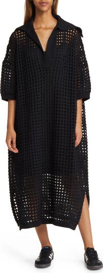 Open stitching creates an airy, boho-chic effect on an oversized knit dress fashioned with elbow-length sleeves.