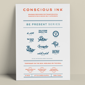 We can't get very far in life if we're not living in the present. Our presence is truly a gift for ourselves and the world. Our Be Present Variety 10-Pack will support you in being here now, instead of yesterday or tomorrow. (Contains 10 different Manifestation Temporary Tattoos. Individually cut. Ready to apply in seconds!)