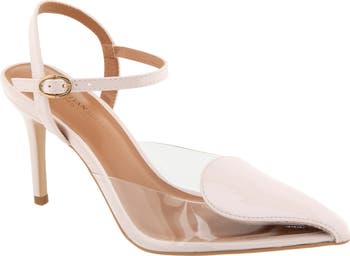 An asymmetric topline and translucent side panels create stunning dimension on a pointy-toe pump set on a svelte heel and secured with an adjustable buckle closure.