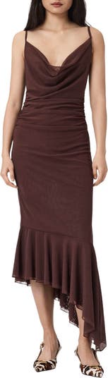 A serious slant at the hem calls out the rippling flow finishing a ruched-to-fit mesh dress that's all in for nights out.