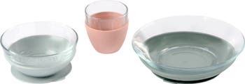Make mealtimes even easier with this scratch-resistant glass set lifted by suction pads that fix to the table or baby's tray. The ergonomic shape of the bowl, plate and cup help little ones learn to eat meals by themselves.