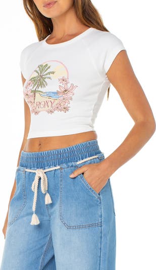 Faded island scenery takes you straight to the tropics in this finely ribbed T-shirt with a cropped length that pairs well with your favorite high-waisted styles.