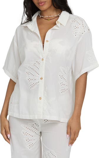 Stroll down cobbled streets or someplace closer to home in a free-spirited cover-up shirt crafted from an airy cotton weave punctuated with eyelet elements.