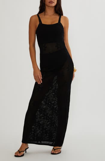 This maxi-length cotton sweater-dress is knit with subtle floral jacquard blooms that reveal themselves in the semisheer skirt, while the straps adjust with buttons in front for an easily customized fit.