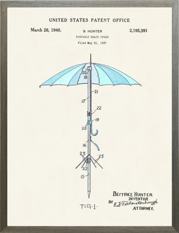 This vintage-inspired print, framed in a black wooden frame, features a beach umbrella patent. Sized at 16 inches by 20 inches, this made in the USA frame makes for a beautiful addition to any wall.