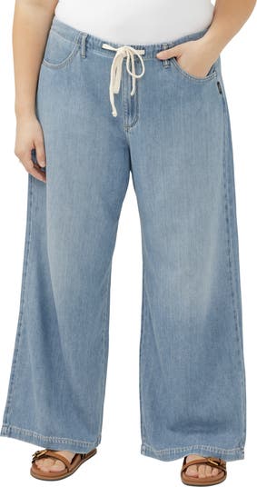 These lightweight jeans are designed with a drawstring waist, wide legs and a dreamy shade of washed-out blue.