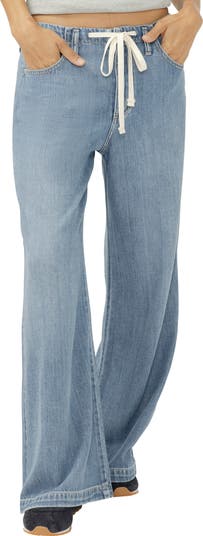 These lightweight jeans are designed with a drawstring waist, wide legs and a dreamy shade of washed-out blue.