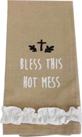 Add a warm, sentiment-driven touch to your kitchen with the Bless This Hot Mess Embroidered Cotton Tea Towel, a single 100% cotton towel in a tan ground featuring an embroidered design with personality and charm. The towel displays the phrase Bless This Hot Mess in white block lettering, positioned beneath a small black embroidered cross with delicate leaf sprigs, creating a faith-inspired and gently humorous everyday accent. The embroidered details are worked directly into the tan cotton with clean, defined stitching that gives the sentiment a polished and readable finish. A gathered white ruffle trim along the bottom hem adds a softly decorative cottage touch that elevates this towel from a simple functional piece to a charming kitchen display accent. Made from 100% cotton and machine washable, this towel is built for regular use in the kitchen as a dish towel, hand towel, or decorative accent. The tan, white, and black palette suits farmhouse, cottage, and faith-inspired kitchen décor, and this towel makes a thoughtful and practical gift for anyone who loves expressive, sentiment-driven kitchen accents.