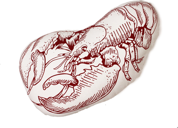 - The pillow is shaped and cut to follow the full silhouette of a lobster, with a detailed botanical illustration-style print in deep red on a cream ground that captures the form and texture of a lobster with graphic, artistic precision.