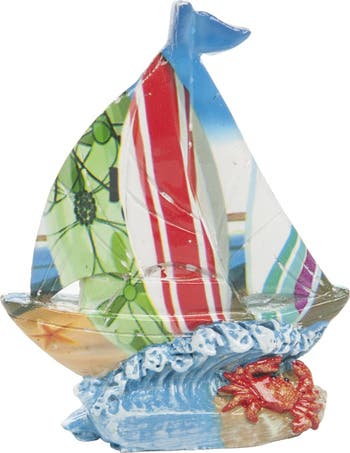 Small resin sailboat figure is colorful and sits on a wave and sand base. It measures 3.75"x1.5"x4"